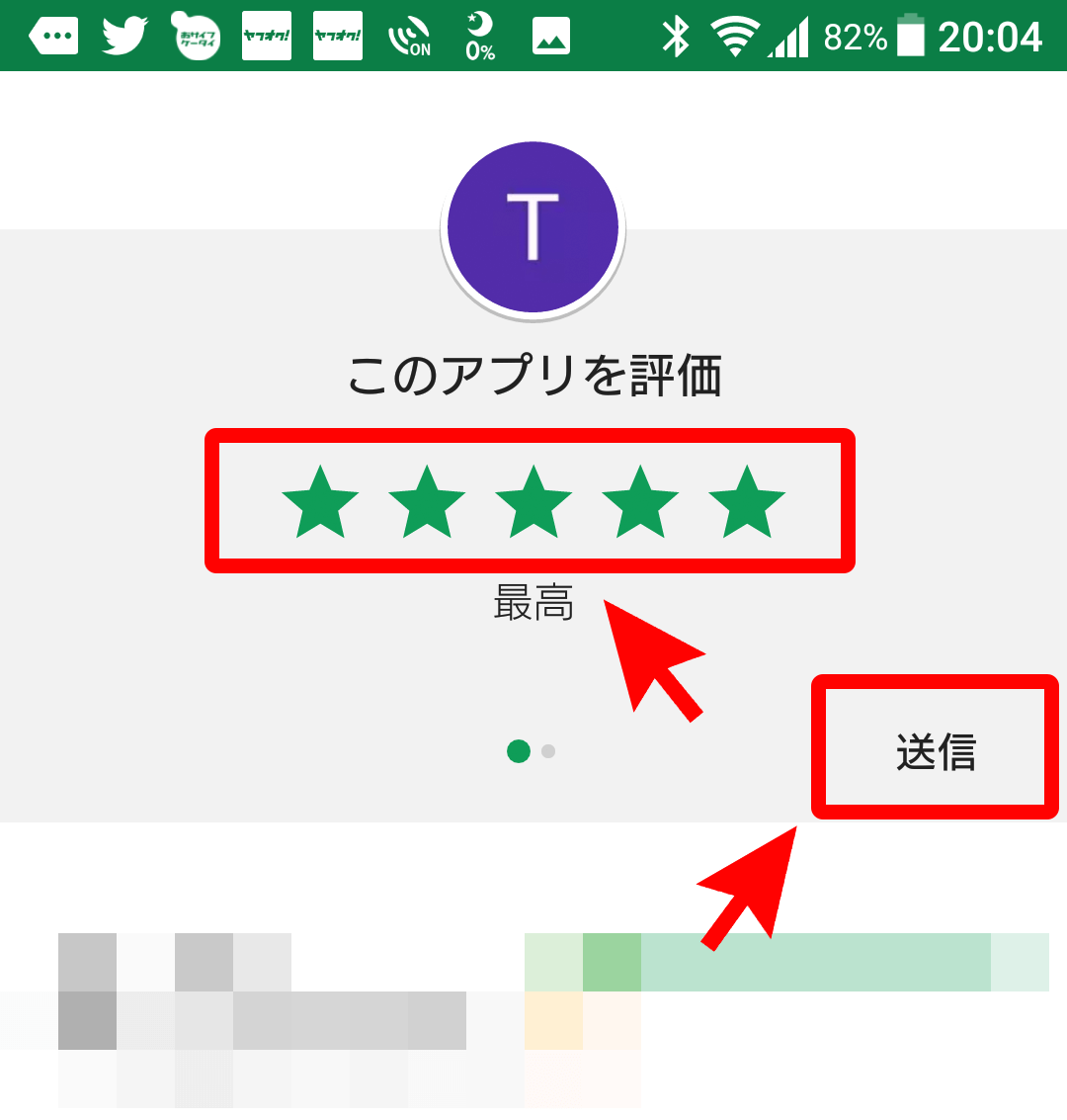 (1)「このアプリを評価」の画面で星の数を決め[送信]をタップ!