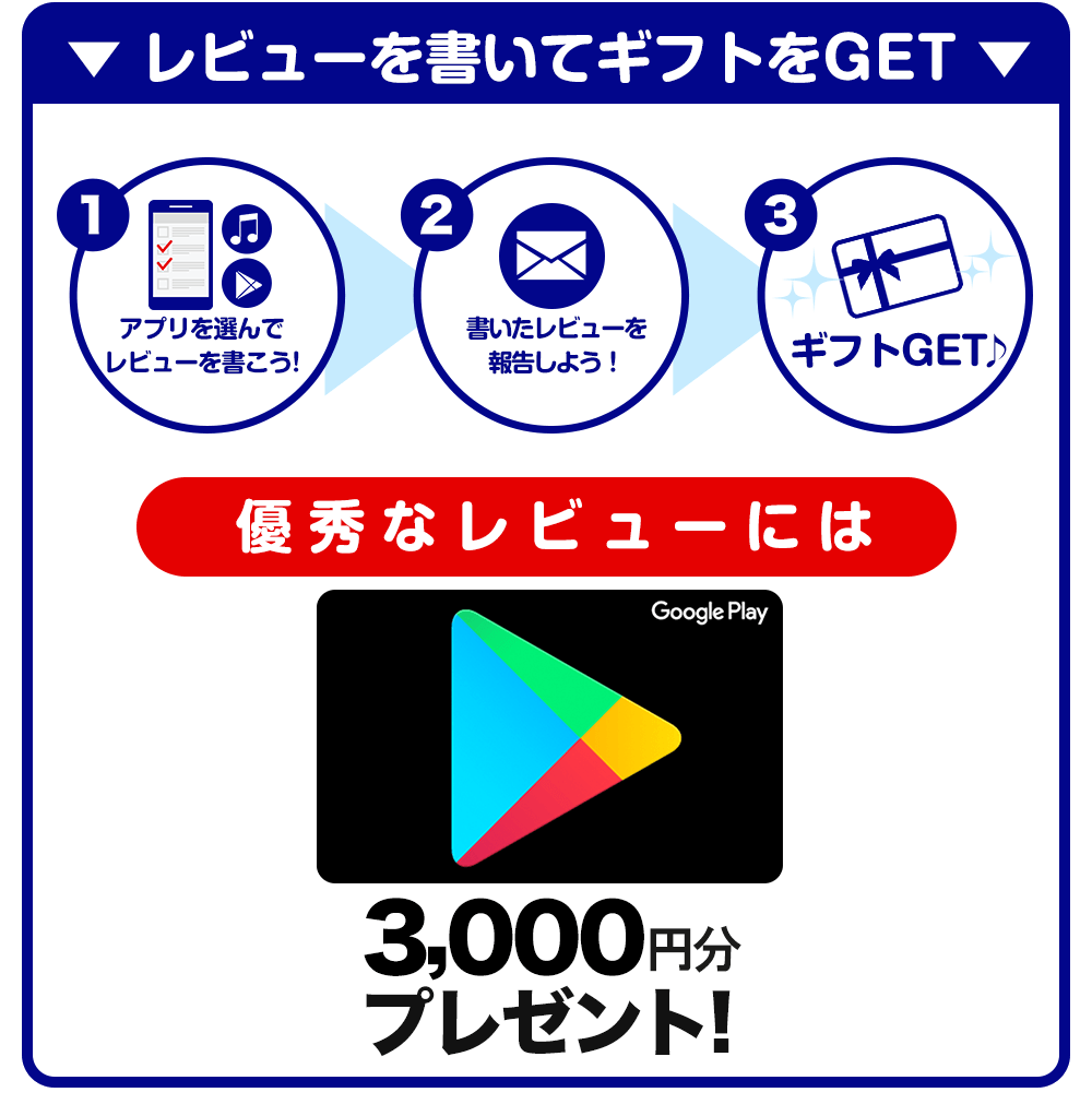※審査後承認全員にamazonギフト100円分、優秀者にGooglePlayギフト3千円分をさしあげます。
